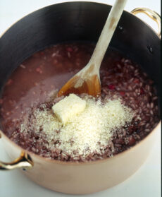 Spegni il fuoco quando il risotto degli ubriachi è ancora al dente. Regola di sale e manteca con il rimanente burro e il parmigiano.