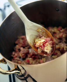 Quindi aggiungi un mestolino di brodo di carne caldo. Prosegui la cottura per altri 3-4 minuti finché la cipolla non risulterà trasparente e il brodo sarà evaporato del tutto. Spella la salamella e tagliala a tocchetti. Taglia a dadini la pancetta e uniscile entrambe al soffritto.