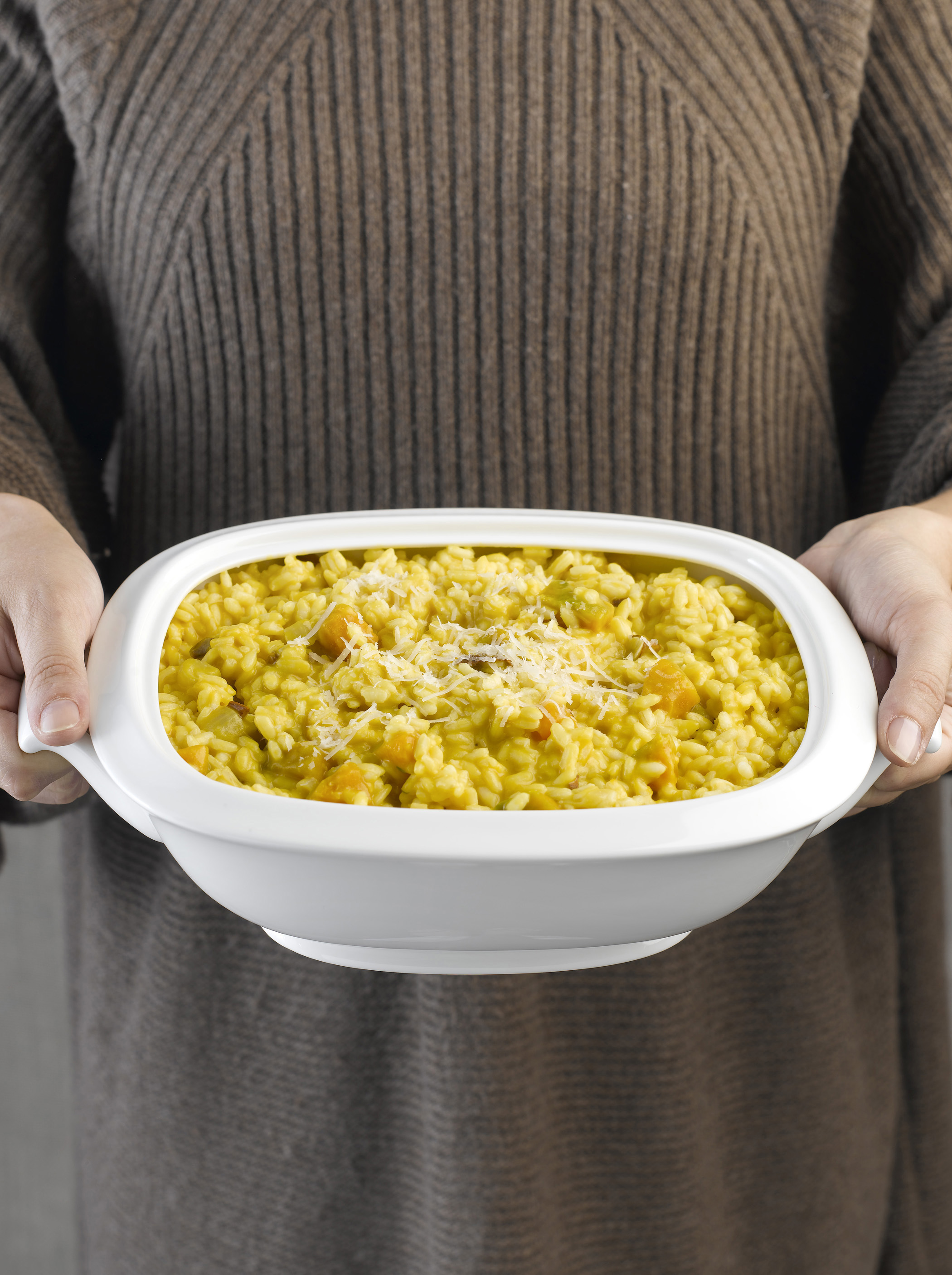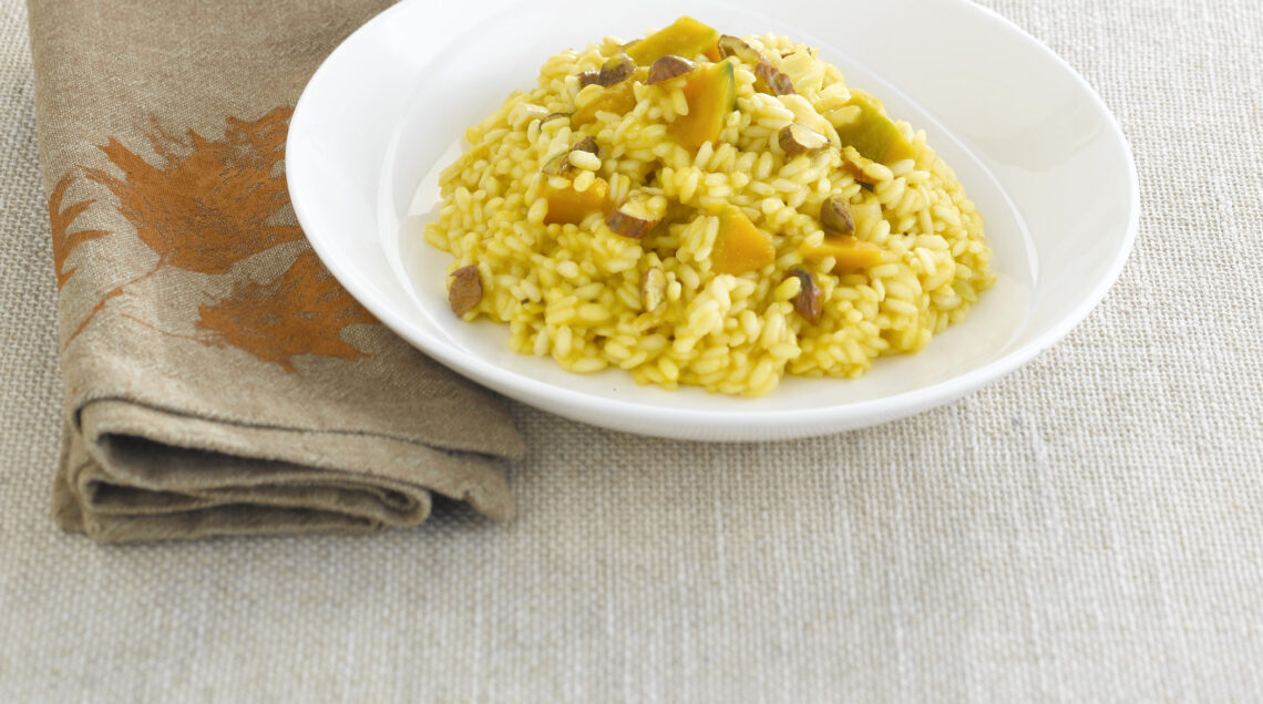 Dolce e cremoso, il risotto Carnaroli con zucca di Dorno e sciroppo di mostarda di Voghera è un concentrato di sapori e colori, accattivanti già al primo cucchiaio. Super anche quello alla crema di gorgonzola, preparato con Vialone nano e zucca Delica.