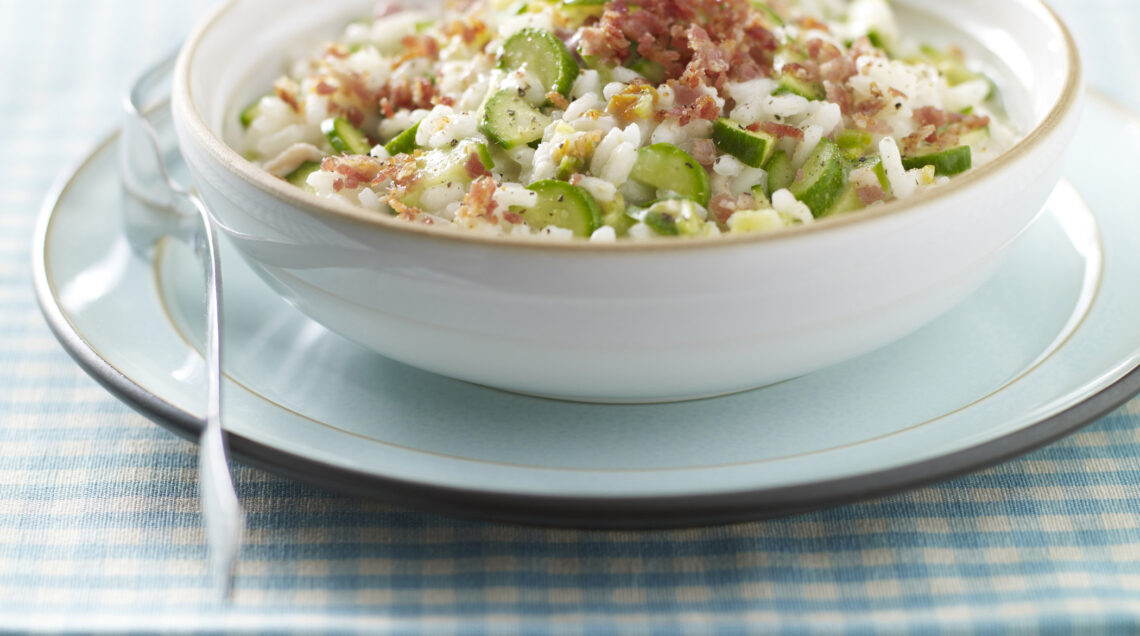1) Unisci le zucchine al risotto a metà cottura e prosegui versando altro brodo. Intanto tosta le fettine di bacon in una padella antiaderente: quando sono croccanti, mettile a scolare poi trita anch’esse.