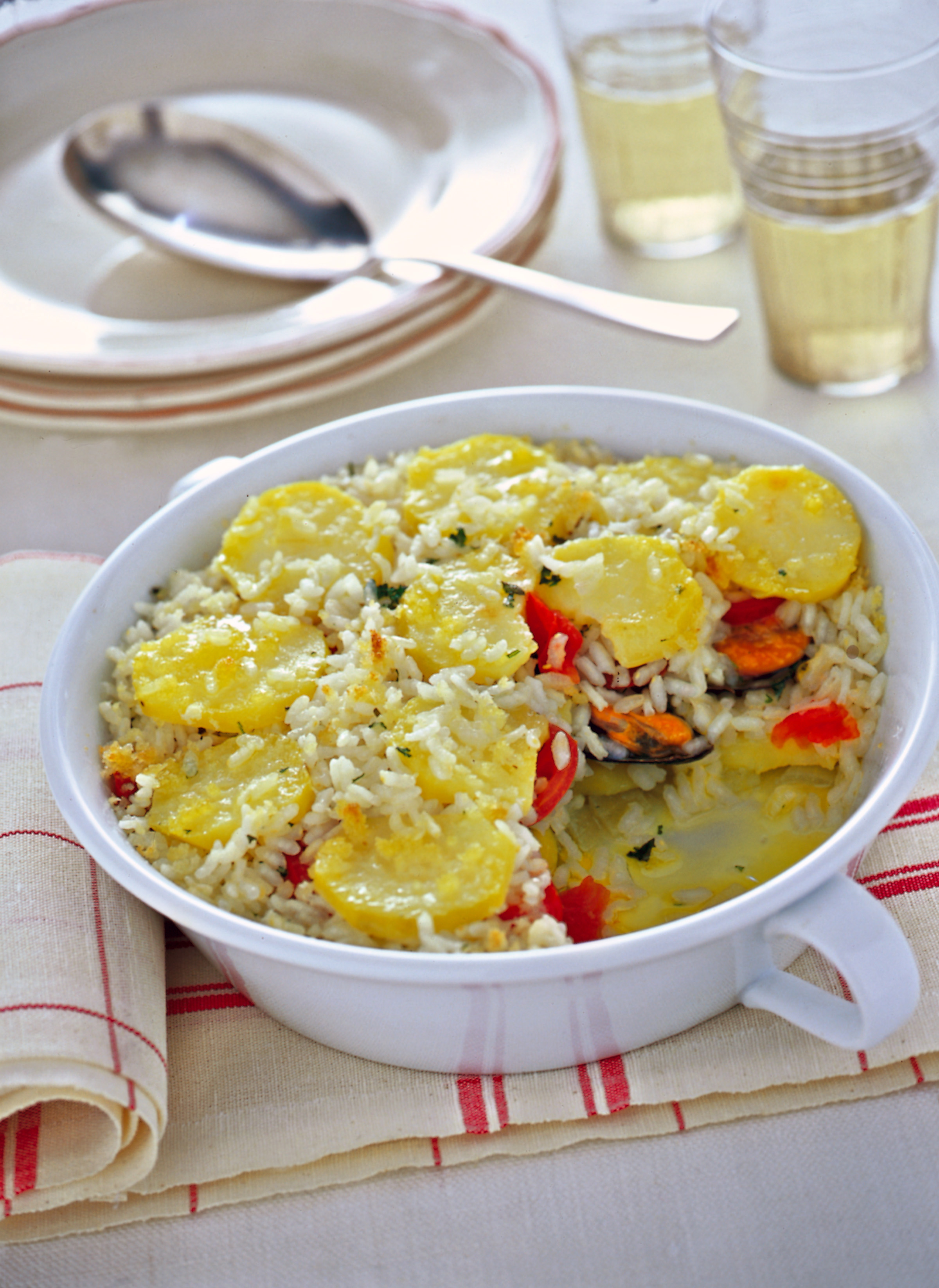 4) Ungete con olio una pirofila, fate uno strato con metà cipolla, continuate con metà delle patate e metà dei pomodori. Trasferite metà del riso nella pirofila, livellatelo e spolverizzatelo con metà del pecorino grattugiato. Disponetevi sopra le cozze con la valva rimasta, copritele con il riso rimasto e completate con il pecorino grattugiato, 1 strato di cipolla, 1 di pomodori e 1 di patate.