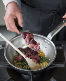 Riempiteli con il risotto, schiacciandolo leggermente con il cucchiaio di legno per eliminare i vuoti, poi passate i savarin in forno a 150° per 8 minuti. Sformateli delicatamente sui singoli piatti, conditeli con il ragù di regaglie ben caldo e spolverizzateli di parmigiano.