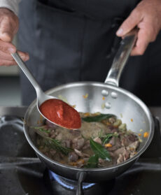 Spruzzatele con 1/2 bicchiere di vino, alzate la fiamma e fatelo evaporare. Unite la passata di pomodoro e mescolate bene per stemperarla nel sughetto.