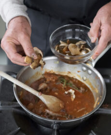 Aggiungete i funghi scolati dall'acqua e strizzati e continuate la cottura per circa 20 minuti, mescolando ogni tanto e unendo, se necessario, poco brodo; alla fine eliminate gli aromi e regolate di sale e pepe.