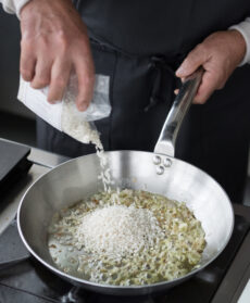 Tritate gli scalogni e fateli soffriggere in una padella con 50 g di burro e 2 cucchiai di olio; unite il riso e fatelo tostare mescolando con un cucchiaio di legno. Sfumate il riso con il vino bianco, alzate la fiamma e lasciatelo evaporare. Versate un mestolo di brodo bollente e continuate la cottura aggiungendo man mano altro brodo; dopo una decina di minuti unite lo zafferano stemperato in poco brodo.