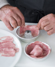 Togliete il risotto dal fuoco ancora al dente. Imburrate 4 stampini da savarin e foderateli con le fettine di lingua salmistrata.