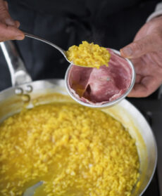 Uno sformato gourmet, preparato con risotto allo zafferano avvolto in sottili fettine di lingua salmistrata. Il sigillo di gusto è firmato dal ragù di rigaglie, che profuma di funghi ed erbe aromatiche. Il sapore passa dalla gentilezza dei chicchi gialli all'audacia del condimento rosso. Assolutamente da provare