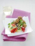 2) Trita la cipolla e i pomodori secchi e soffriggili in poco olio. Unisci la salsa di pomodoro e cuoci per 30 minuti (se si asciuga, bagna con acqua calda). Frulla la salsa e adagia le polpette.