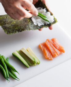 Dividete a metà i fogli di alghe nori e posatene una nella mano sinistra. Deponete un cucchiaio colmo di riso sul lato sinistro del foglio, spalmate una punta di wasabi (se lo usate) e farcite con fagiolini, salmone e avocado. Arrotolate con la mano destra la parte libera dell’alga sopra il ripieno e create un cono che fisserete incollando i lembi sovrapposti con un velo di acqua. Servite accompagnando, se vi piace, con salsa di soia.