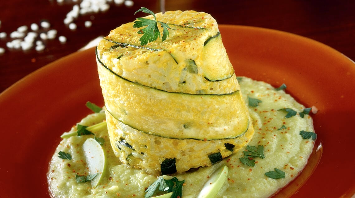 3) Imburra 4 stampini da budino lisci della capacità di 2 dl, taglia la zucchina rimasta a strisce e fanne aderire 2 a spirale