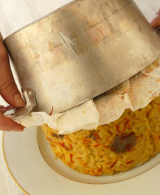 Foderate con carta da forno uno stampo a tronco di cono, imburratelo e rovesciatevi dentro il riso; battete lo stampo sul piano di lavoro, in modo da eliminare i vuoti d'aria, livellate la superficie con il dorso di un cucchiaio e passate in forno caldo a 200° per circa 20 minuti.