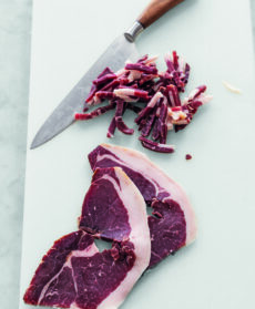 Con un coltello affilato tagliate il prosciutto a listarelle di circa 5 cm.