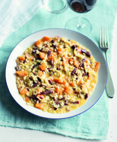 Un primo piatto creativo e gourmand, con frutta e salume. Per ospiti di gusto