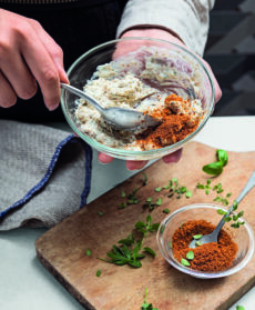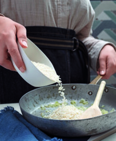 Montate il burro a temperatura ambiente in una ciotola con la bottarga grattugiata, le erbe aromatiche tritate e qualche goccia di succo di limone. Trasferite il burro su un foglio di carta da forno, formando un cilindro, e avvolgetelo a caramella nella carta da forno. Trasferitelo in frigo a indurire. Tostate intanto il riso in una padella senza condimento e tenetelo da parte.