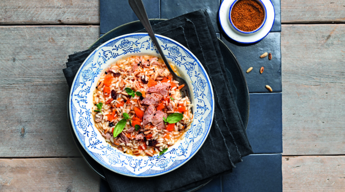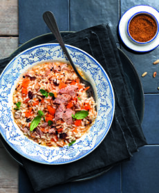 Incorporate l'uvetta e la ventresca di tonno sgocciolata dall'olio di conservazione, tenendone da parte un po' per decorare. Cuocete per 2-3 minuti e mantecate il risotto unendo il burro alla bottarga a pezzetti. Servite il risotto decorandolo con la ventresca di tonno tenuta da parte, i pinoli, pepe e, a piacere, foglioline di erbe aromatiche.