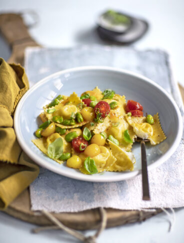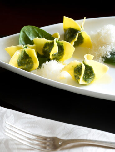 5 Lessate i ravioli in acqua bollente salata finché salgono in superficie e serviteli con burro fuso, insalatina e fiori eduli.