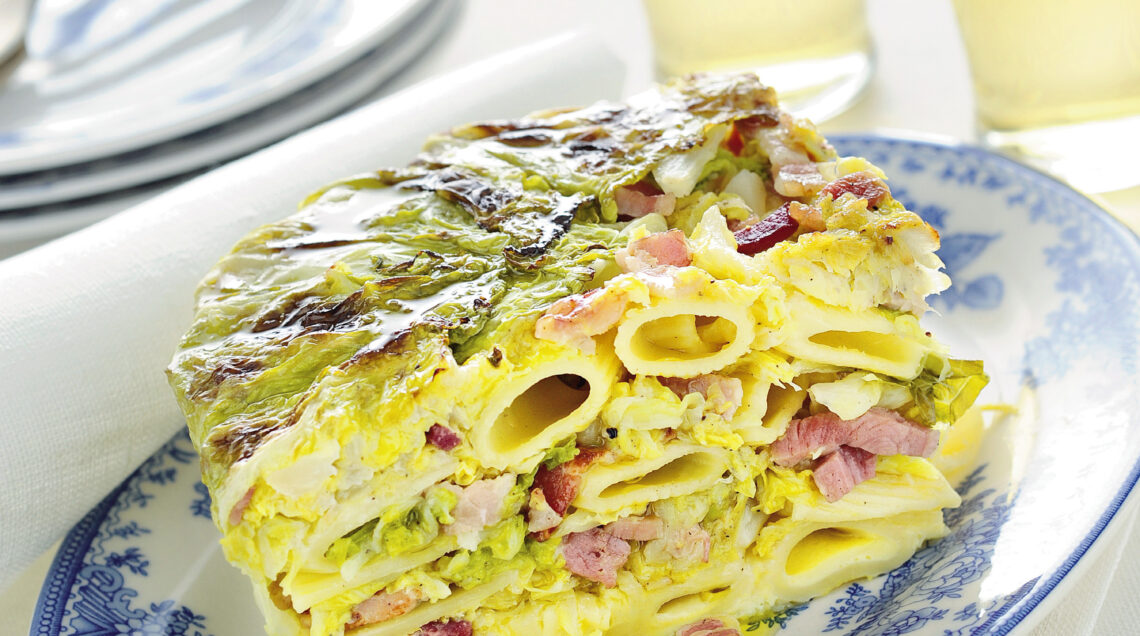 4) Riempi il guscio con la pasta disponendola a strati e alternandola con le verze al bacon; ribalta su di essa le foglie che sbordano, copri con un foglio di carta di alluminio e cuoci la pasta alla verza in forno a 200° per 20 minuti e a 220° per 10 minuti. Sforma e servi.