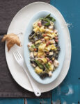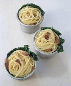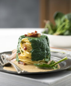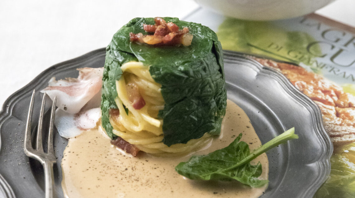 Aggiustate di sapore e densità. Cuocete gli spaghetti in acqua salata, scolateli al dente, mantecateli con il resto delle uova, guanciale e parmigiano grattugiato, quindi metteteli negli stampini individuali imburrati, foderati con foglie di spinaci sbollentate.