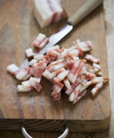 Tagliate il guanciale a listarelle sottili e fatelo andare in poco olio finché non è ben croccante, quindi sgrassate e mettete un filo d'olio.