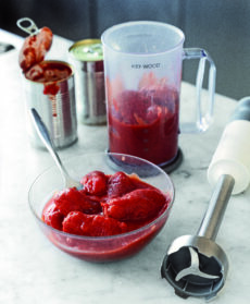 Frullate i pelati con un frullatore a immersione.