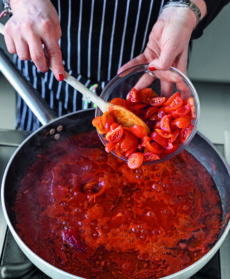 Accendete e il fuoco e, quando il sugo sobbolle, aggiungete i pomodorini e un pizzico di sale.