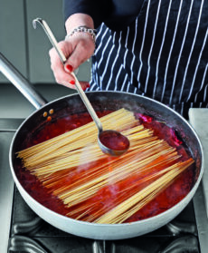 Fate cuocere con il coperchio per 15 minuti circa, poi aggiungete gli spaghetti crudi. Aiutandovi con un mestolo ricoprite la pasta con il sugo.