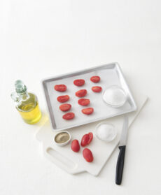 Preparate la composta. Disponete i pomodori datterini tagliati a metà nel senso della lunghezza in una teglia con la parte tagliata a vista. Condite con 10 ml d'olio, il sale, lo zucchero e 2 macinate di pepe. Infornate a 150 ° per 1 ora e 30 minuti.