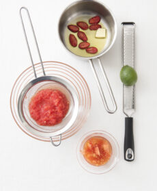 Estraete dai pomodori a grappolo i semi con la loro parte gelatinosa cercando di lasciarli più integri possibile. Frullate quel che rimane e setacciate in modo da ricavarne l'acqua. Assemblate la composta di pomodoro mettendo in un pentolino 5 grammi d'olio, il burro e i pomodori datterini lasciandone alcuni da parte. Lasciate cuocere a fuoco medio per circa 1 minuto, togliete il tutto dal fuoco, unite i semi di pomodoro e la scorza del lime, il succo dei pomodori e frullate col frullatore a immersione.
