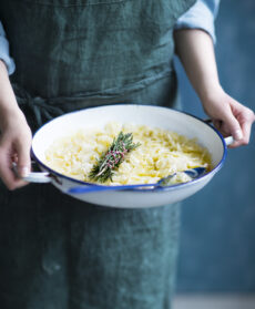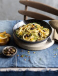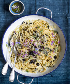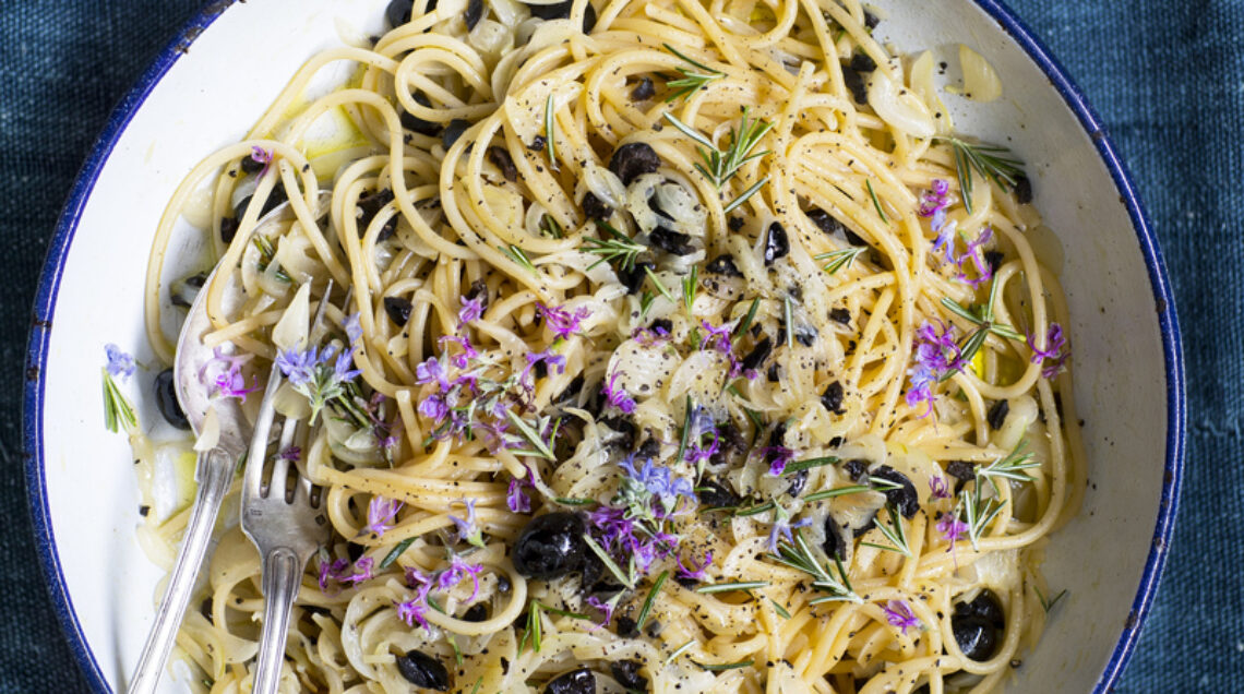 Lessate la pasta al dente, scolatela e ripassatela in padella con il sugo preparato, 2 cucchiai di acqua di cottura della pasta e 2 cucchiai di olio. Completate con ciuffetti e fiori del rosmarino rimasto, pepe, olio crudo e servite.