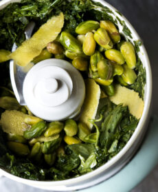 1 Sbollentate i pistacchi per 1 minuto e mezzo in acqua bollente. Scolateli, privateli della pellicina esterna e asciugateli bene. Lavate il limone e prelevate la parte gialla della scorza con un pelapatate ad archetto. Lavate e asciugate tutte le erbe e trasferitele in un mixer con i pistacchi, la scorza dal limone, 1 cucchiaino di sale grosso e 1 cubetto di ghiaccio; azionate il mixer unendo a filo circa 1,5 dl d'olio fino a ottenere un pesto fluido e omogeneo. Regolate di sale.