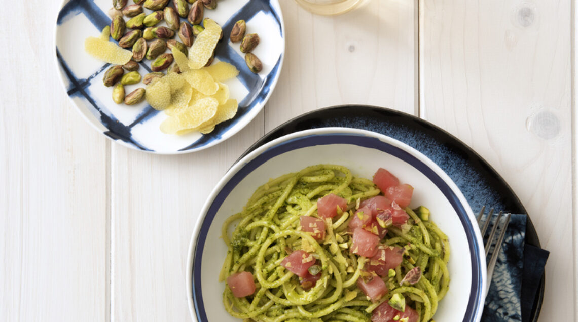 3 Scolate gli spaghettoni, trasferiteli nella ciotola e conditeli con il pesto, aggiungete il tonno a cubetti e servite subito. Se vi piace, potete decorare con qualche pistacchio tritato e scorza di limone grattugiata al momento.