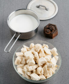 Eliminate la crosta del pane, poi tagliatelo a pezzetti, raccoglieteli in una terrina, copriteli di latte caldo, posatevi sopra un coperchio con un peso e lasciateli riposare per un paio d'ore.