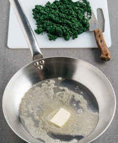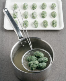 Scolateli, lasciateli intiepidire, strizzateli molto bene e tritateli finemente. Scaldate in una padella 30 g di burro e saltatevi gli spinaci a fuoco vivo, facendoli bene asciugare.
