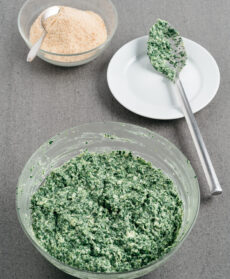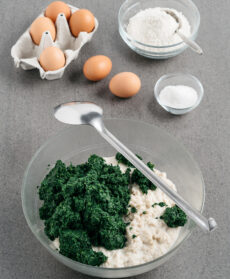 Strizzate il pane (è consigliabile metterlo in un telo e torcerlo in modo da eliminare tutto il latte), mettetelo in una ciotola capiente e mescolatevi gli spinaci.