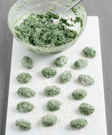 Prelevate l'impasto con un cucchiaio e con le mani infarinate formate tanti grossi gnocchi, gli strangolapreti; sistemateli man mano su un vassoio o su un tagliere infarinato.