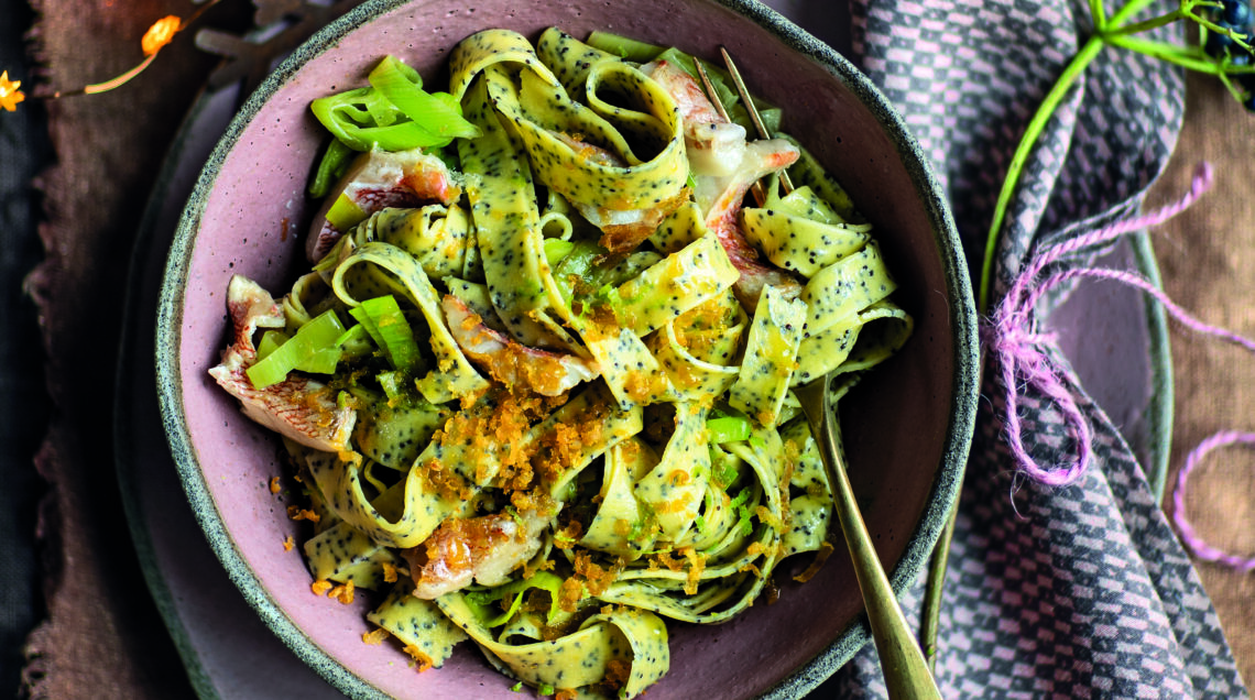 Il condimento di porri e scorfano avvolge le tagliatelle fresche ai semi di papavero con un sapore verace. Un ventata aromatica arriva dalla scorza di bergamotto, il sapido sigillo dalla bottarga. Un primo perfetto per la cena della Vigilia