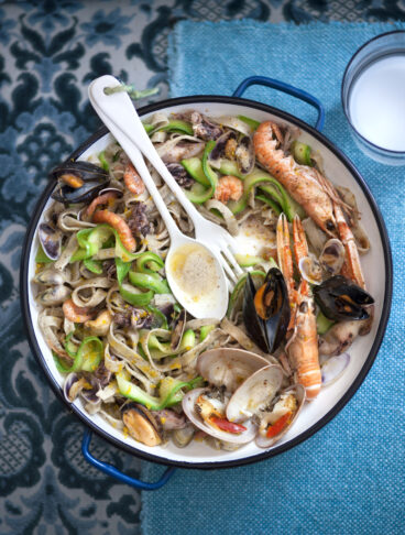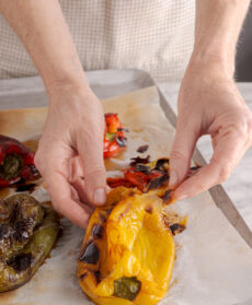 Sciacquate 1 piccolo peperone rosso e 1 giallo, sistemateli su una placca foderata con un foglio di carta da forno e fateli arrostire sotto il grill del forno per circa 15 minuti, rigirandoli un paio di volte. Toglieteli dal forno, copriteli con una ciotola e aspettate che intiepidiscano un po' prima di spellarli. Privateli anche del picciolo e dei semi e tagliateli a striscioline.