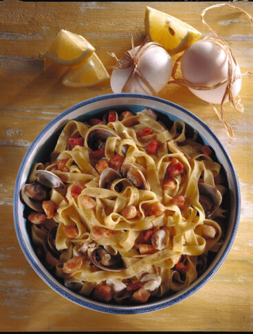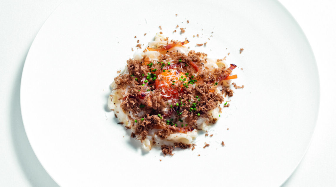 Le tagliatelle di questa ricetta sono realizzate con i calamari e condite con guanciale, pecorino, pepe e tuorli, come vuole la tradizione capitolina. Un piatto gourmand
