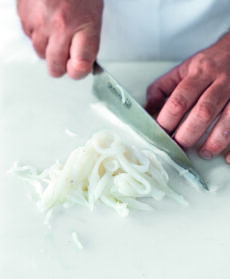 Per tagliare il calamaro a fettine sottili, riponetele almeno un'ora nel congelatore e poi usate un coltello tagliente a lama liscia.