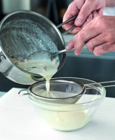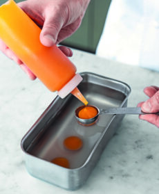 Riempite più volte un cucchiaino per la sferificazione con il mix d'uovo e adagiate le sfere nel contenitore con l'alginato per 40 secondi circa, finché assumono una consistenza gelatinosa. Prelevatele, sciacquatele e immergetele in una ciotola con olio di semi. Per la ricetta servono 4 sfere; usate quelle rimaste per altre preparazioni.