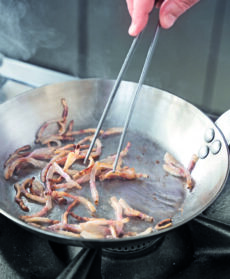 Fate dorare leggermente in padella il guanciale tagliato a julienne sottile senza condimento, girandolo con una pinza.
