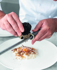 Tagliate la testa d'aglio in 2 metà orizzontali, tostatele in un pentolino con un po' di cotenna di guanciale, le croste del pecorino e le bucce del tartufo, sale, 1 cucchiaino di pepe nero in grani. Unite la panna, fatela ridurre della metà a fuoco bassissimo e passatela al colino. Frullate il tuorlo pastorizzato, la xantana, il gluconato e 1 g di sale e versate in un biberon. A parte frullate l'alginato in 1 litro d'acqua; versatelo in un contenitore basso.