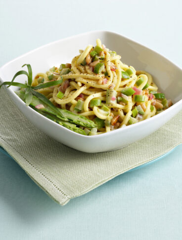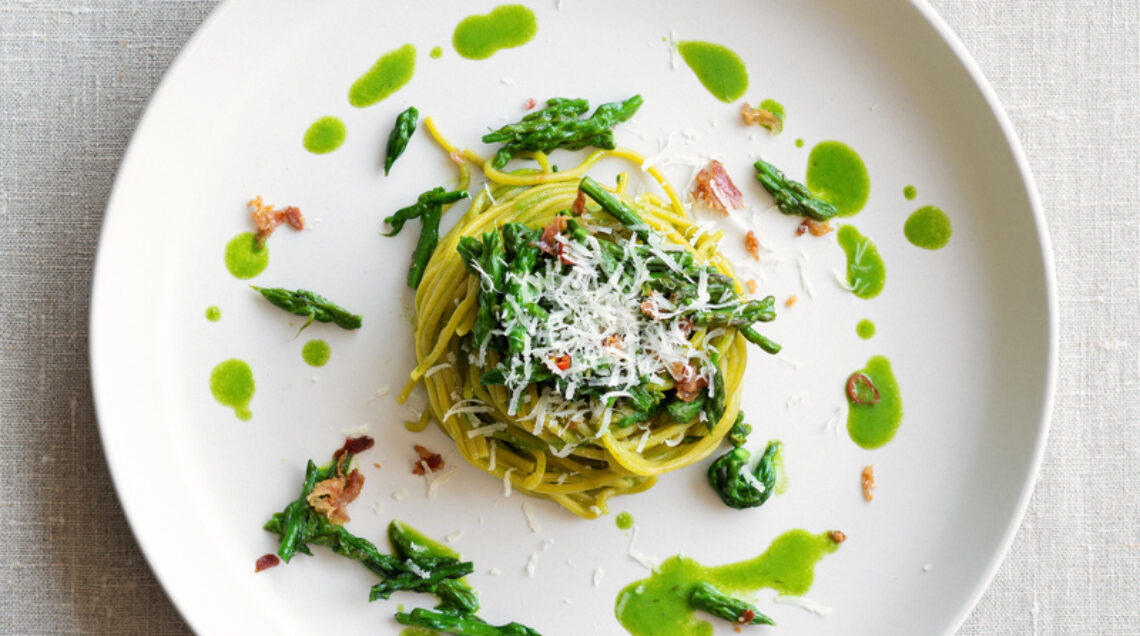Una ricetta creativa e gourmand che vede protagonisti gli asparagi selvatici di cui si usa anche il succo centrifugato. Un'idea sostenibile e di recupero