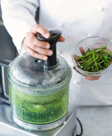 Pulite e mondate gli asparagi: asciugateli delicatamente, tagliate i gambi e tenete le punte da parte. Centrifugate i gambi per estrarre il succo.