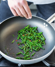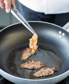 Scolateli prelevandoli con la pinza e metteteli man mano nella padella con gli asparagi.