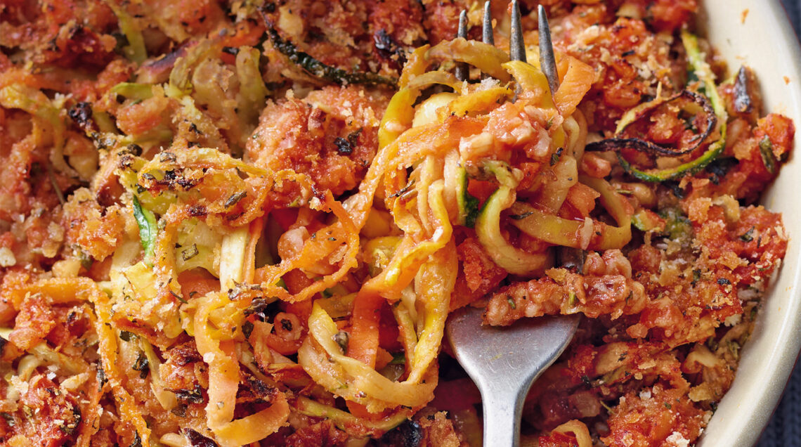 4 Ungete una pirofila con un giro d'olio. Distribuite uno strato di spaghetti di verdura, uno di ragù, poi il resto della verdura e del ragù. Cospargete con il mix di pangrattato, noci ed erbe e passate sotto il grill finché prende colore. Sfornate e servite subito.