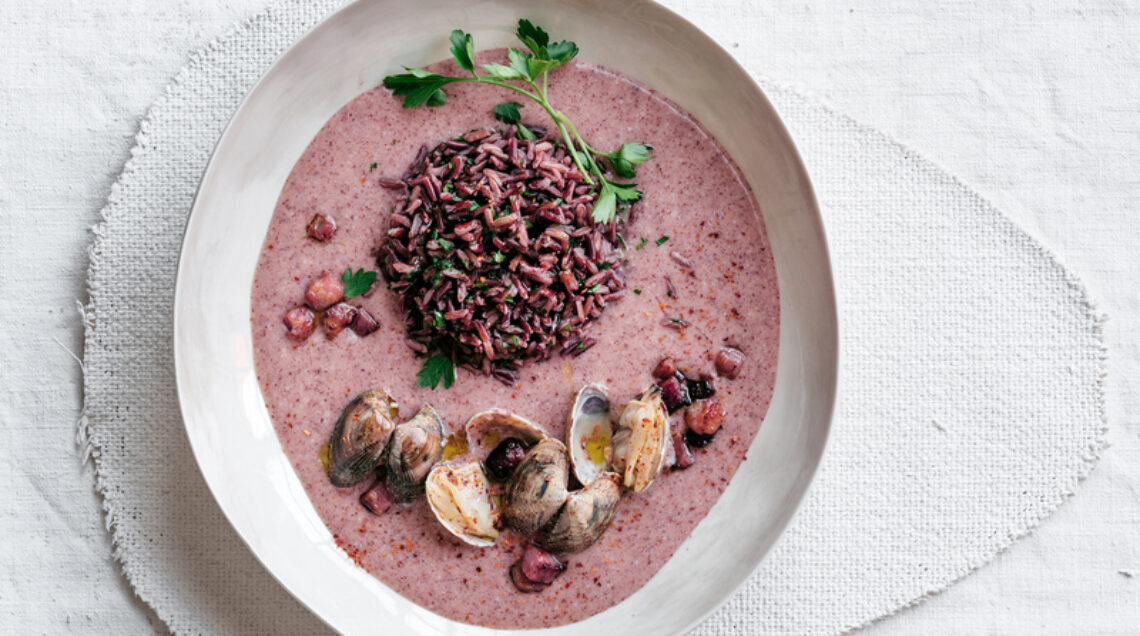 Un primo creativo a base di riso rosso, in chicco e in vellutata. Vongole e pancetta ne arrotondano il gusto in equilibrio con le note piccanti del peperoncino