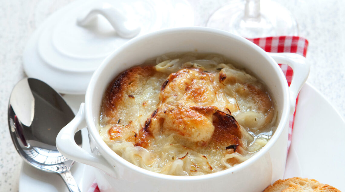 3) Tagliate la baguette in 12 fettine. Suddividete la zuppa in 4 ciotole, adagiate in ognuna 3 fettine di pane, cospargete con il gruyère grattugiato e passate le ciotole sotto il grill del forno per 6-7 minuti fino a che il formaggio inizia a dorare. Profumate con una macinata di pepe e servite.