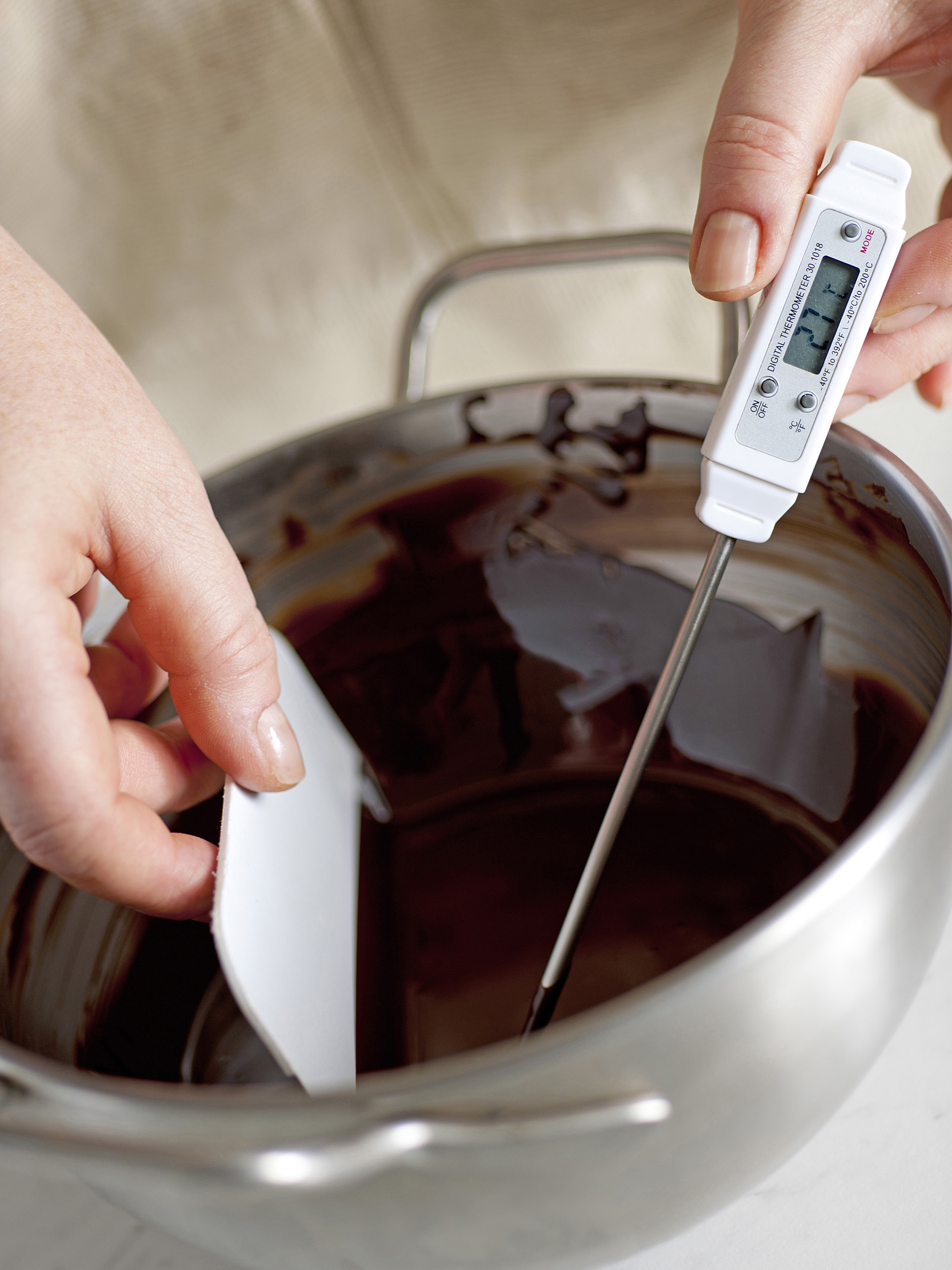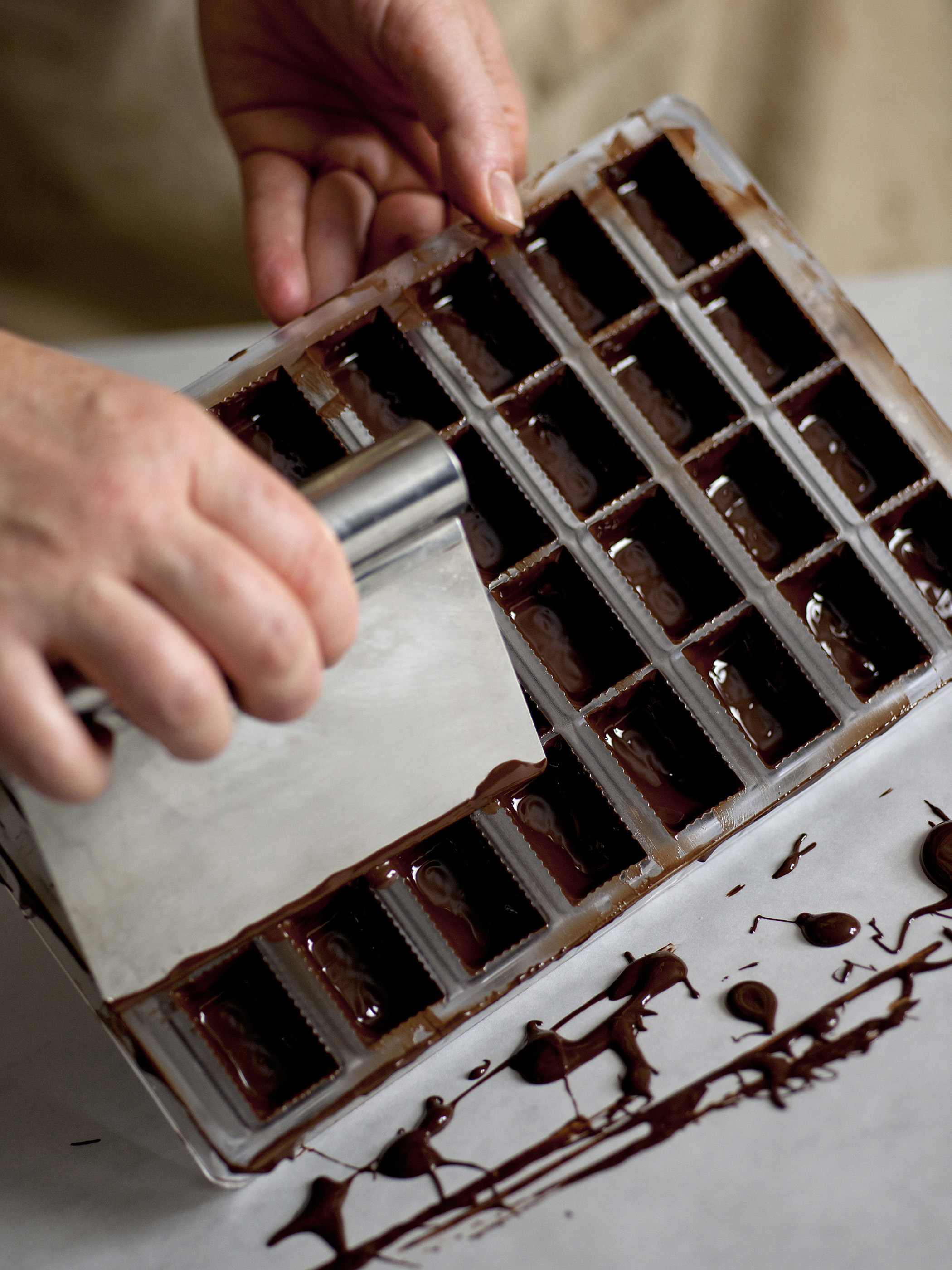 2) Inclinate gli stampi per distribuire il cioccolato in maniera uniforme e fate colare quello in eccesso, raccogliendolo in una ciotola. Raddrizzate gli stampi e raschiate il cioccolato sbordato con una spatola.