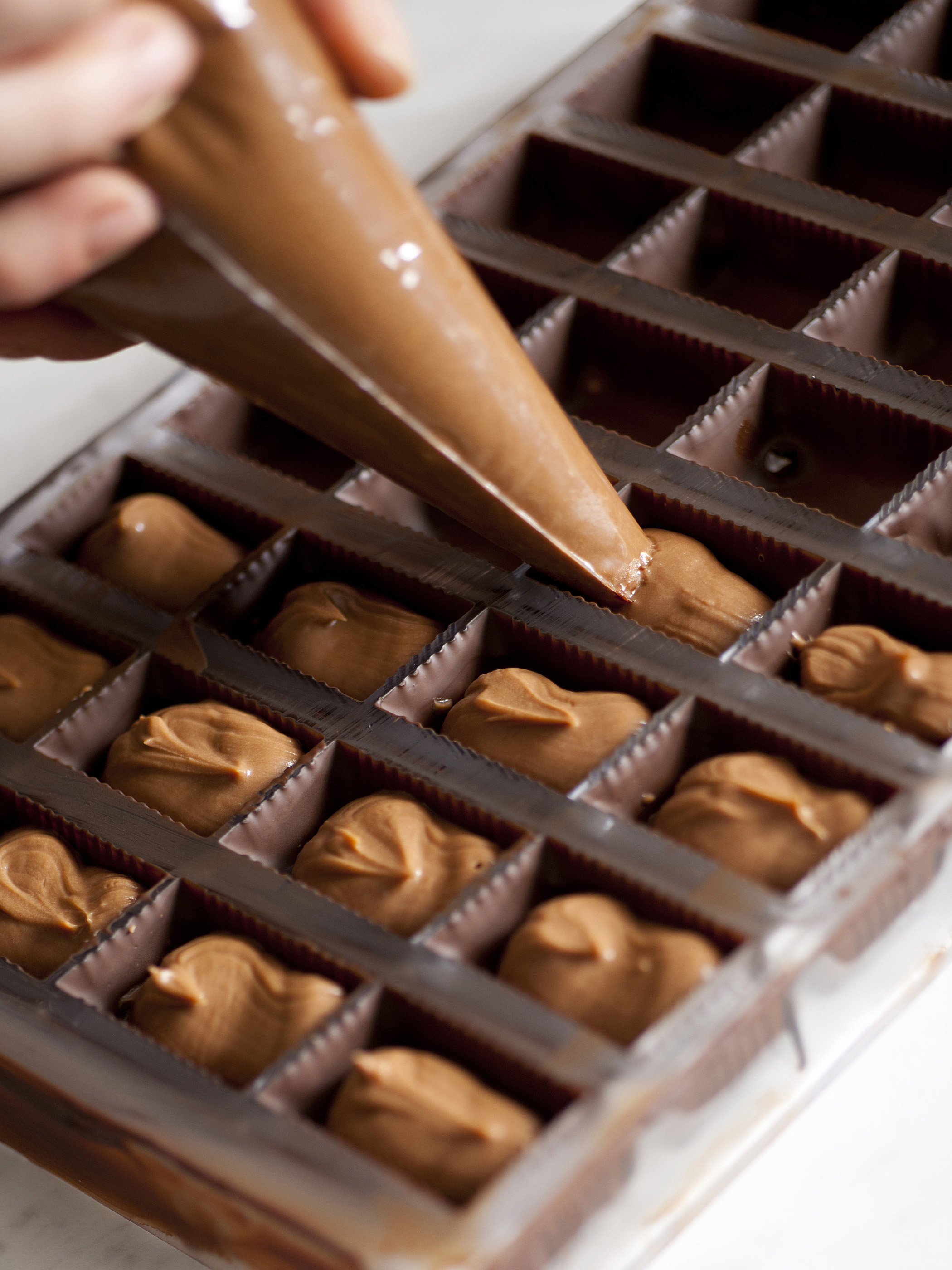 3) Fate raffreddare in freezer per 10 minuti, poi versate il cioccolato fondente rimasto negli stampini per chiudere i cioccolatini, raschiate via l'eccesso e lasciate solidificare i quadrotti in luogo fresco per 2-3 ore. Rovesciate gli stampi sul piano di lavoro e batteteli finché i cioccolatini si staccano.